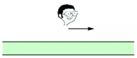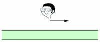 Figure 1: The symmetry argument used to show that the electric field points away from an infinite, uniformly charged plane. The observer in the first diagram, facing in the direction of a hypothetical tangential component of the field as shown by the arrow, expects to see the third diagram if he turns around, but instead sees the second.Suppose that the electric field at a particular point above the plane had a component parallel to the plane. Let's call the direction of the electric field the $x$-direction. An observer, standing at this point, might initially face so as to see the electric field pointing straight in front of him, as shown in the first drawing in Figure 1. But, if that observer then turns in place to face a different direction, he would expect to see the electric field still pointing straight in front of him because of the symmetry of what he sees. Indeed, if he had been blindfolded when he turned, he could not tell, by looking at the charge distribution everywhere, that he had turned at all. This scenario is shown in the third drawing in Figure 1. Nevertheless, the fact that the observer has turned has not changed the electric field. If it initially had a component in the $x$-direction, it must still have a component in the $x$-direction. So the observer actually sees the situation depicted in the second drawing in Figure 1, which is not what he expected. The only way to resolve this contradiction is to recognize that our original assumption cannot be true. The electric field cannot have a component parallel to the plane. A similar argument using the translational symmetry, as shown in Figure 2, shows that the electric field can only depend on the distance from the plane. And another similar argument shows that the electric field must in fact point in opposite directions on opposite sides of the plane. The electric field must therefore be of the form \begin{eqnarray*} \EE = E(z) \, \zhat \end{eqnarray*} assuming that the $z$-direction is orthogonal to the plane.