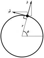 It is important to realize that $d\rr$ and $ds$ are defined geometrically, not by (\ref{drdef}) and (\ref{dsdef}). To emphasize this coordinate-independent nature of $d\rr$, it is useful to study $d\rr$ in another coordinate system, such as polar coordinates ($r$,$\phi$) in the plane. It is also natural to introduce basis vectors $\{\rhat,\phat\}$ adapted to these coordinates, with $\rhat$ being the unit vector in the radial direction, and $\phat$ being the unit vector in the direction of increasing $\phi$. 1)