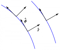 A somewhat more sophisticated argument begins by differentiating \begin{equation} \rr = r\,\rhat \end{equation} to obtain \begin{equation} d\rr = dr\,\rhat + r\,d\rhat \end{equation} and then comparing this result with the known (geometrically derived) formula \begin{equation} d\rr = dr\,\rhat + r\,d\phi\,\phat \end{equation} which verifies (\ref{drh}) immediately. We can determine $d\phat$ by noticing that \begin{equation} 0 = d(\phat\cdot\phat) = 2\,\phat\cdot d\phat \end{equation} so that, first of all, $d\phat$ has no $\phat$ component. More generally, this argument shows that any derivative of a vector of constant length must be perpendicular to the original vector. Furthermore, we have \begin{equation} 0 = d(\phat\cdot\rhat) = d\phat\cdot\rhat + \phat\cdot d\rhat \end{equation} which tells us that the $\rhat$ component of $d\phat$ must be $-d\phi$. Putting these two facts together yields (\ref{dph}), as expected.