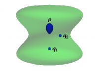 This situation is illustrated in Figure 1, which shows an arbitrary region containing two point charges, $q_1$ and $q_2$, as well as a third region with nonzero charge density, $\rho$. In this case, $Q_{\hbox{enclosed}}$ would be the result of adding the sum of the point charges to the total charge in the third region.