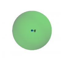 As an example, consider a point charge $q$ inside an imaginary sphere of radius $r$, as shown in Figure 2. The electric field due to the charge is \begin{eqnarray*} \EE = \frac{1}{4\pi\epsilon_0} \frac{q}{r^2}\, \rhat \end{eqnarray*} and the surface element is \begin{eqnarray*} d\AA = r^2 \sin\theta \,d\theta\,d\phi\,\rhat \end{eqnarray*} Thus, the flux is given by \begin{eqnarray*} \Int_{\hbox{sphere}} \EE \cdot d\AA &=& \Int_{\hbox{sphere}} \frac{1}{4\pi\epsilon_0} \frac{q\,\rhat}{r^2} \cdot \rhat\,dA \\ &=& \frac{1}{4\pi\epsilon_0} \frac{q}{r^2} \times (\hbox{surface area}) \\ &=& \frac{q}{\epsilon_0} \end{eqnarray*} as claimed. (Why was it ok to replace the integral with the surface area?) Note that the value of this integral does not depend on the radius $r$ of the spherical surface.