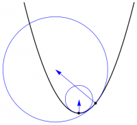 This construction is depicted in Figure 1, which shows the best-fit circle at two points on a parabola, together with vectors pointing to the center of each circle. The magnitude of the arrows gives the radius of curvature at each point, which is the reciprocal of the curvature, and the direction of the arrows is the principal unit normal vector at that point.