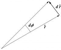 A somewhat more sophisticated argument begins by differentiating \begin{equation} \rr = r\,\rhat \end{equation} to obtain \begin{equation} d\rr = dr\,\rhat + r\,d\rhat \end{equation} and then comparing this result with the known (geometrically derived) formula \begin{equation} d\rr = dr\,\rhat + r\,d\phi\,\phat \end{equation} which verifies (\ref{drh}) immediately. We can determine $d\phat$ by noticing that \begin{equation} 0 = d(\phat\cdot\phat) = 2\,\phat\cdot d\phat \end{equation} so that, first of all, $d\phat$ has no $\phat$ component. More generally, this argument shows that any derivative of a vector of constant length must be perpendicular to the original vector. Furthermore, we have \begin{equation} 0 = d(\phat\cdot\rhat) = d\phat\cdot\rhat + \phat\cdot d\rhat \end{equation} which tells us that the $\rhat$ component of $d\phat$ must be $-d\phi$. Putting these two facts together yields (\ref{dph}), as expected.