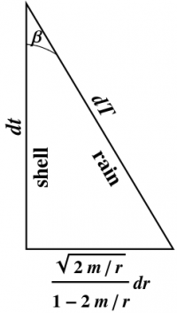 Thus, \begin{equation} \sigma^T = dT \end{equation} To see that this basis is indeed associated with freely falling observers, set $\sigma^R=0$ in (\ref{Rform}) (“standing still”), which implies that $\tanh\beta=\sigma^r/\sigma^t$ as desired. Furthermore, if $\sigma^R=0$, $\sigma^T=dT$ measures proper time. Thus, $T$ is the proper time of the freely falling observers. We therefore refer to $\{\sigma^T,\sigma^R\}$ as the “rain” frame. 1) The relationship between rain coordinates and our original “shell” coordinates is shown in Figure 7.