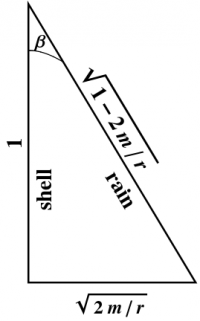 We digress briefly to introduce “rain” coordinates adapted to freely falling observers who start from rest at $r=\infty$, each of whom moves along a geodesic as described in the preceding section. As shown there, a shell observer sees such observers fall past them with speed \begin{equation} \tanh\beta = -\sqrt{\frac{2m}{r}} \end{equation} Drawing a right triangle to these proportions, as shown in Figure 6, or using the algebraic relationships between the hyperbolic trig functions, we find \begin{align} \cosh\beta &= \frac{1}{\sqrt{1-\frac{2m}{r}}} \label{rcosh}\\ \sinh\beta &= -\frac{\sqrt{\frac{2m}{r}}}{\sqrt{1-\frac{2m}{r}}} \label{rsinh} \end{align}