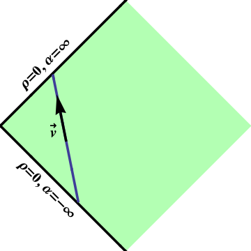 Which of these interpretations is correct? Neither! We know that the geodesics in Minkowski space are straight lines, such as the one shown in Figure 1. An object moving along a straight line in Minkowski space will cross the line $\rho=0$, which is just $x=\pm t$, at the same constant speed it started with.