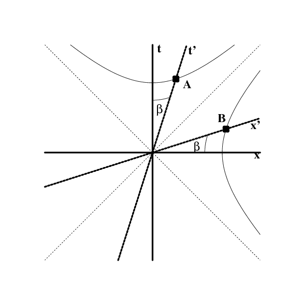 moving at speed $\vc=\tanh\beta$ is shown as a hyperbolic rotation.