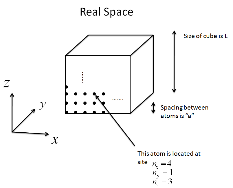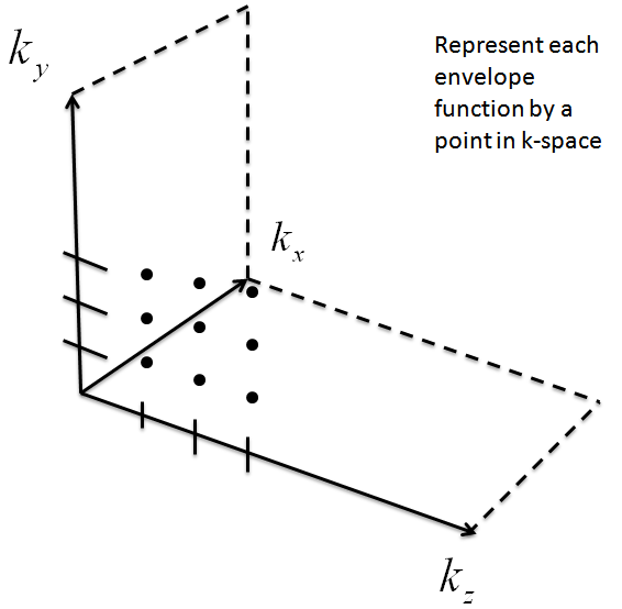 where $n_{x}$, $n_{y}$, and $n_{z}$ all define the location of the atom in real space, while $k_{x}$, $k_{y}$, and $k_{z}$ all define what the wave number is for the envelope function in the x,y, and z orientation.