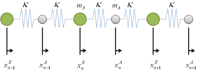 $$m_{A}\ddot{x}_{n}^{A} \, = \, -\kappa\left(x_{n}^{A}-x_{n-1}^{B}\right) - \kappa \left(x_{n}^{A}-x_{n}^{B}\right) \; \; $$