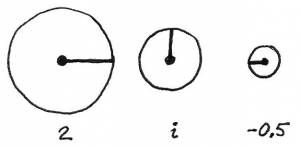 The instructor points out that visualizing complex numbers on a spherical surface is challenging, and then describes a way to visually represent a field of complex numbers. The visual representation is based on stylized Argand diagrams (examples below).