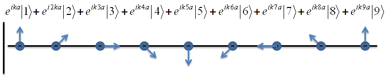 On the board, write the equation: SUM OVER j {(exp(i*2πx/8a - ωt)|j>}. Ask the students to act it out this LCAO.