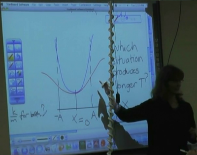 After the explanation, students are given two different potential energy vs. displacement graphs: one parabolic and one sinusoidal, with the same curvature at the bottom (see picture above) and the same amplitude. Students then work in small groups to determine which motion would have a greater period.