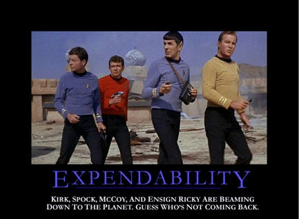 Ask for volunteers to play the roles of Captain Kirk and Mr. Spock. The instructor takes the role of Scotty. (Stand on the table to indicate the you are orbiting in a spaceship.) Everyone else is a “red shirt” who wants to be promoted to a shirt of another color. The “red shirts” are the one-time characters in the show who can be killed off without long-term consequences to the show. To be promoted to a shirt of another color, students will have to impress Scotty with their calculational ability so that he will recommend them.