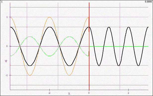 Vizualization of a sinusoidal wave incident from the left on an abrupt boundary. The wave is reflected and transmitted, with the wave on the left being a superposition of the incident and reflected sinusoids and hence neither pure traveling nor pure standing (except for two special cases).