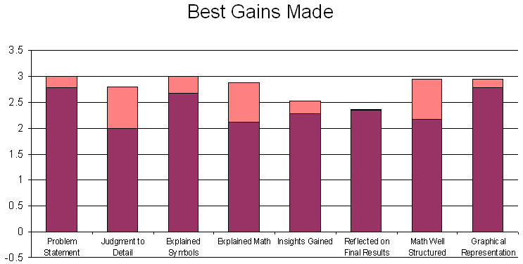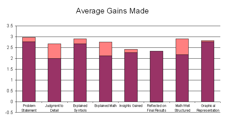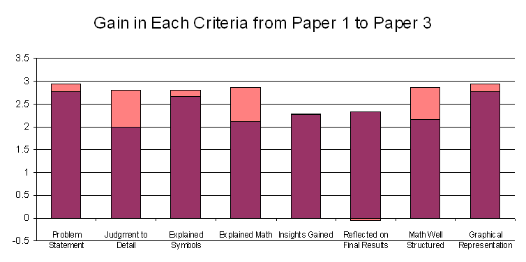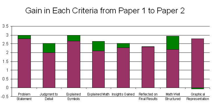By taking the average of these changes, the following graph is obtained. It represents an average in the change from paper 1 to paper 2, and the change from paper 1 to paper 3. Because the 2nd and 3rd activities may have had conceptually more difficult material about which to write, an average of the two changes smooths out aberrations due to student misconceptions and poor understanding of the activity on which the writing was based. Note however that if there were improvement in a criteria from paper 2 to paper 3, this average will minimize the apparent overall gain in that criteria.