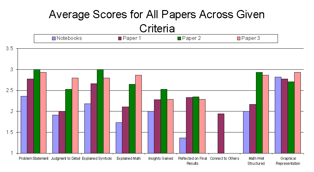 To measure how student writing changed throughout the process, each paper had been scored using the rubric. The graph below shows the average scores for a given rubric criteria across all three papers students produced. It also includes scores from notebook samples taken from the previous year of students. Note that a 3 is the highest possible average score for a given criteria.