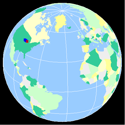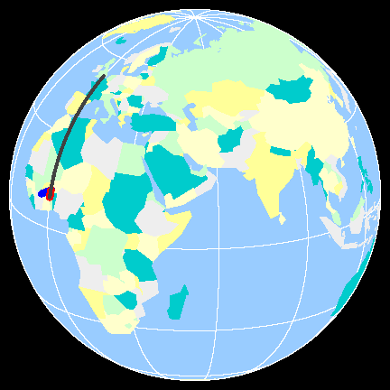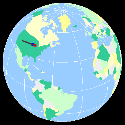 The following animations show the result of shooting a hockey puck on a perfectly round, frictionless, rotating Earth. The black line gives the great circle path the puck would follow if the Earth were not rotating, the blue line gives the great circle it actually follows, and the red line shows the apparent path as seen from the Earth. Click on the picture to start the animation.