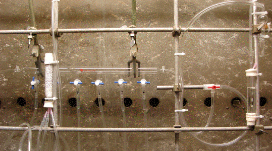C. Procedures for the safe handling of pyrophoric liquids C1. General: Before commencing any experiment involving a pyrophoric liquid ensure that the fume hood to be used is clear of clutter and that any unnecessary potentially combustible materials have been removed (REMEMBER, fume hood space should never be used for solvent storage). Appropriate PPE must be worn and other safety equipment as detailed above should be in place and in good working order (Section B). The control of an inert atmosphere is best handled by a dedicated gas manifold system provided with exit bubblers and multiple gas delivery lines (see Image C1-1). Argon gas is to be generally preferred over nitrogen gas because it is heavier than air. At all times during operation, the inert gas delivery system must have at least one open bubbler protected vent point to prevent over pressurization and the possibility of explosion.