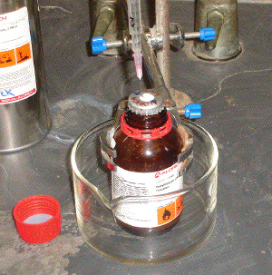 C3. Dispensing via syringe: A single syringe transfer is appropriate for delivery of reagent volumes of up to ca. 15 mL. A little above this threshold, multiple separate syringe transfers may be employed; however, for signficantly larger volumes (>50 mL) the cannula transfer technique described below should be contemplated. Gas-tight glass syringes with needle-locking mechanisms are generally to be preferred; however, polyethylene/polypropylene syringes with friction needle locks may be used with caution (PE/PP syringes are naturally hydrophobic and seldomly seize during operation, unlike glass syringes). Before starting, check that the syringe is in good working order (plastic syringes that are old, cracked, or larger than 20 mL in barrel volume should not be used) and that the needle is not blocked (18 or 20-gauge stainless-steel needles of at least 8" in length are recommended). The syringe size selected should be AT LEAST 25% bigger than any single volume to be dispensed to minimize the possibility of pulling the plunger clear out of the barrel during operation. Once the reaction vessel (the contents of which should already be under an inert gas atmosphere) is ready to receive the liquid pyrophoric reagent of interest, navigate the following operations in turn: (a) stand the reagent bottle on the base of the fume hood within a secondary containment vessel (e.g., a glass crystallizing dish) and clamp to prevent accidental tipping; (b) with a gentle flow of inert gas passing through the manifold (i.e., exit bubbler open), spike the protective septum of the reagent bottle with an open inert gas input line (Image C3-1). Any excess pressure inside the bottle will be safely relieved via the open manifold exit bubbler;