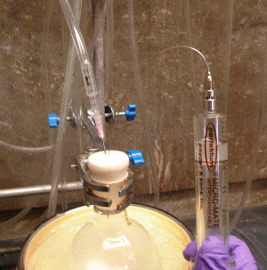 (g) push the syringe needle through the septum covering the reaction vessel and, keeping the syringe inverted for now, gently push the plunger up (Image C3-7). When the plunger reaches the graduation mark originally targeted, the dead volume in the needle will be full again; pushing the plunger further will now begin to introduce the reagent to the reaction vessel (Image C3-8). Add the reagent at a rate appropriate for the experiment. When the plunger reaches the zero mark, the exact volume of reagent measured will have been added to the reaction. At this stage, the needle should still be full of reagent - DO NOT add this volume to the reaction, it would be in addition to that measured (NOTE: the needle dead volume is compensated for because it was fully occupied when the desired reagent volume was measured and it remains full after this same volume has been dispensed); (h) draw the excess reagent in the needle back into the inverted syringe and transfer it back into the reagent bottle. The tiny quantity of residual reagent remaining in the needle and syringe at this point (< 0.05 mL) still presents a fire hazard. In most cases, sucking excess water rapidly into the syringe will suffice to safely quench this material; however, only do so away from flammable solvents because a small spark may form momentarily. Finally, after ensuring that the pyrophoric reagent bottle remains well purged with inert gas, the gas input line can be removed and the bottle resealed and returned to its appropriate storage location (typically a refrigerator).