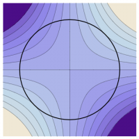 Now consider the problem of finding the local maxima/minima of $f$ subject to the constraint $g=\hbox{const}$. The idea is to consider the level set (curve or surface) on which $g$ has the given value. The first fact above implies that $\grad{g}$ is everywhere perpendicular to this curve or surface. Furthermore, the second fact above implies that, at a local maximum/minimum, $\grad{f}$ is perpendicular to any curve in the level set. Thus, at a local maximum/minimum, we must have: \begin{equation} \grad{f}\parallel\grad{g} \end{equation} This relationship is shown geometrically in Figure 1, which shows the level curves of $f$, together with a heavy line representing the constraint curve $g=\hbox{const}$. The maximum and minimum values of $f$ clearly take place where the constraint curve is tangent to the level curves.