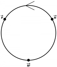 The geometric argument used in the above construction shows that the volume, and hence the triple product, is independent (up to sign) of the order of the vectors used to define it. Taking signs into account, we have: \begin{equation} (\uu\times\vv)\cdot\ww = (\vv\times\ww)\cdot\uu = (\ww\times\uu)\cdot\vv \end{equation} with the other three orderings differing by a minus sign. The three orderings $\{\uu,\vv,\ww\}$, $\{\vv,\ww,\uu\}$, $\{\ww\,\uu,\vv\}$ are called cyclic permutations of each other; if one is right-handed, they are all right-handed. Note also that \begin{equation} \ww\cdot(\uu\times\vv) = (\uu\times\vv)\cdot\ww = (\ww\times\uu)\cdot\vv \end{equation} so that it doesn't matter whether the dot product is at the beginning or at the end. The cyclic nature of the triple product is summarized symbolically in Figure 2: So long as you write down the vectors in the order indicated by the arrow, it doesn't matter where you start, nor does it matter which product is a dot product, and which is a cross product. Of course, the parentheses do matter — you must evaluate the cross product before evaluating the dot product.