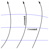Consider a family of geodesics, with velocity vectors of the form \begin{equation} \vv = \dot{\rr} = \Partial{\rr}{\tau} \end{equation}