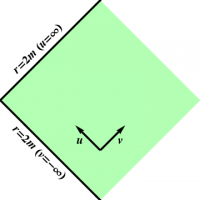 This motivates the definition \begin{align} du &= dt - \frac{dr}{1-\frac{2m}{r}} \\ dv &= dt + \frac{dr}{1-\frac{2m}{r}} \end{align} which we can integrate to obtain \begin{align} \frac{v-u}{2} &= \int \frac{dr}{1-\frac{2m}{r}} \nonumber\\ &= \int \left( 1 + \frac{1}{\frac{r}{2m}-1} \right) \, dr \nonumber\\ &= r + 2m \ln\left(\frac{r}{2m}-1\right) \label{ruv} \end{align} Expression (\ref{ruv}) relating $r$ to $u$ and $v$ is badly behaved at $r=2m$. However, for $r>2m$, the coordinates $(u,v)$ behave much like their namesakes in Rindler geometry, as shown in Figure 1 (compare Figure 1 of § Extending Rindler Geometry). Furthermore, we can extend the geometry across the apparent singularity at $r=2m$ if we exponentiate, which yields \begin{equation} e^{(v-u)/4m} = e^{r/2m} \left(\frac{r}{2m}-1\right) = e^{r/2m} \frac{r}{2m} \left(1-\frac{2m}{r}\right) \label{ruvexp} \end{equation} Inserting (\ref{ruvexp}) back into the factored line element ($\ref{schwf}$) leads to \begin{align} ds^2 &= - \frac{2m}{r} e^{-r/2m} e^{(v-u)/4m} \,du \,dv \nonumber\\ &= - \frac{32m^3}{r} e^{-r/2m} \left(e^{-u/4m} \,\frac{du}{4m} \right) \left( e^{v/4m} \,\frac{dv}{4m} \right) \nonumber\\ &= - \frac{32m^3}{r} e^{-r/2m} \,dU \,dV \label{schwmetUV} \end{align} where \begin{align} U &= -e^{-u/4m} \\ V &= e^{v/4m} \end{align} The line element (\ref{schwmetUV}) is perfectly well behaved at $r=2m$! The coordinates $\{U,V,\theta,\phi\}$ are known as (double-null) Kruskal-Szekeres coordinates. The radial coordinate $r$ can be expressed (implicitly) in terms of $U$ and $V$ via \begin{equation} UV = - e^{(v-u)/4m} = e^{r/2m} \left(1-\frac{r}{2m}\right) \end{equation} Finally, orthogonal coordinates $\{T,X\}$ can be introduced if desired by writing \begin{align} U &= T-X \\ V &= T+X \end{align}