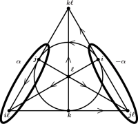 Which planes point to $k$? Which basis units multiply to $k$? There are three lines intersecting in each point in the multiplication table of $\OO$, represented in terms of the 7-point projective plane, so there are three such pairs of units, in this case \begin{equation} k = ij = (j\ell)(i\ell) = \ell(k\ell) \end{equation} An element of $G_2$ “pointing” to $k\ell$ is illustrated in Figure 1. However, combining any two pairs of rotations (by the same angle) yields the third pair, so only two of these three automorphisms are independent. Thus, we have precisely $7\times2=14$ independent automorphisms, which generate $G_2$. But which 14 automorphisms should we pick to be our basis?