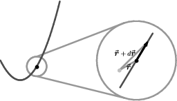 This picture is so useful that we will extend it one step further, and consider an infinitesimal change in position. What does this mean? Zoom in on the curve so much that it becomes straight, as illustrated in the figure above. Instead of $\Delta\rr$, we will write $d\rr$ for the vector between two points on the curve which are infinitesimally close together. For the moment, that's just notation.