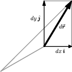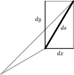 What is the infinitesimal distance $ds$ between nearby points on the curve? Just the length of $d\rr$! We have $$ds = |d\rr|$$ and “squaring” both sides leads to \begin{equation} ds^2 = d\rr\cdot d\rr = dx^2 + dy^2 + dz^2 \label{dsdef} \end{equation} which is just the infinitesimal Pythagorean Theorem, and which is shown (in two dimensions) in the first drawing above. The vector version of the same result is shown in the second drawing; this is just (\ref{drdef}) (restricted to two dimensions).