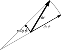 Determining the lengths of the sides of the resulting infinitesimal polar “rectangle” yields \begin{equation} d\rr = dr\,\rhat + r\,d\phi\,\phat \label{drpolar} \end{equation} as shown in the second drawing below. Using (\ref{dsdef}) and again squaring both sides leads to \begin{equation} ds^2 = d\rr\cdot d\rr = dr^2 + r^2 \, d\phi^2 \label{dspolar} \end{equation} which is the infinitesimal Pythagorean Theorem in polar coordinates